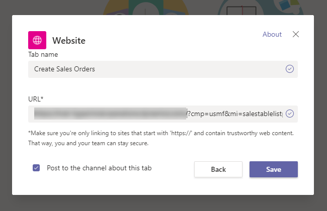 4. Provide a Tab Name and add the URL copied earlier from D365 FinOps and click Save