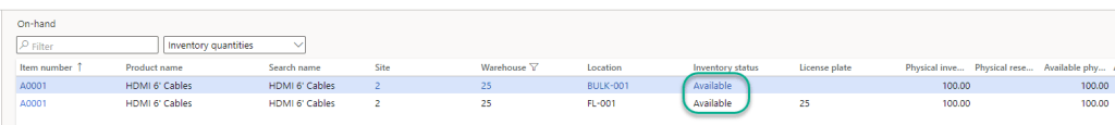 Before we go into the “ Inventory status change” screen we can have a look at the current Inventory on hand for the warehouse “25”. There are 100 quantities in two different locations for the Item “A0001” and most importantly the Inventory Status is “Available“.