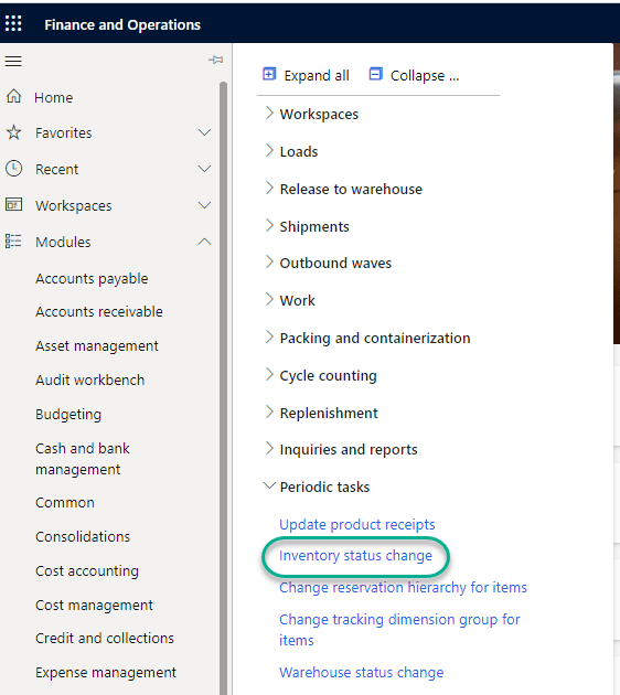 - Go to “ Inventory status change ” menu from Warehouse Management Module under Periodic tasks.