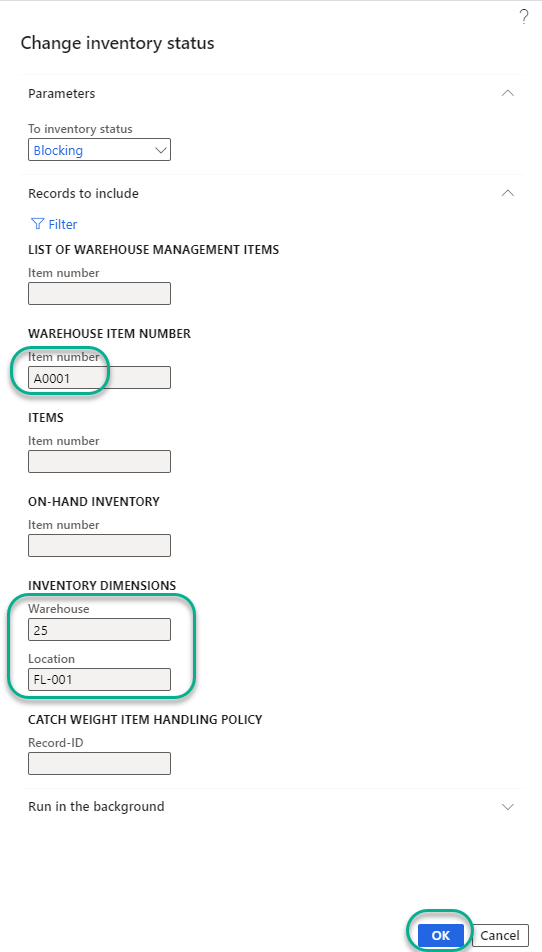 3. Select the “To inventory status” as “Blocking” and apply the respective filter in this scenario let’s say we want to change the status for the Item “A0001” and location “FL-001” in warehouse “25” and click “OK”