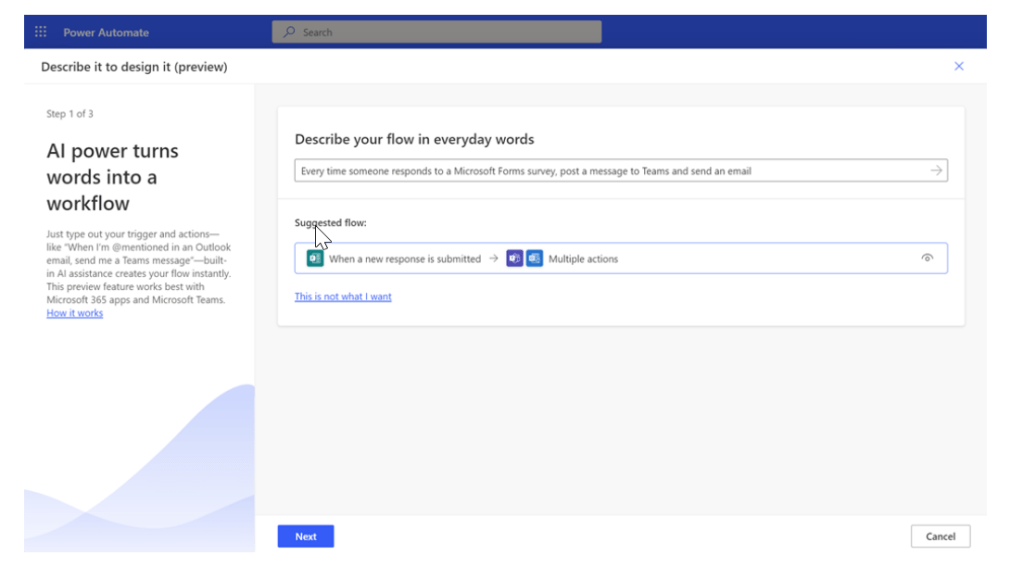 - Now you have the capability to describe what you want to automate in a sentence, and an AI-based copilot will build your flow in seconds. Read more using this link.