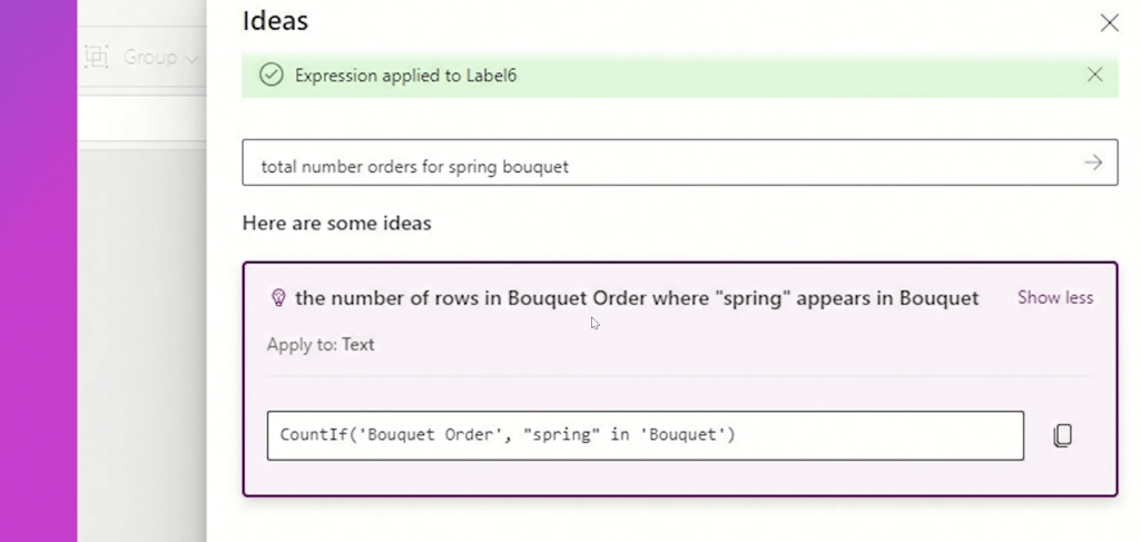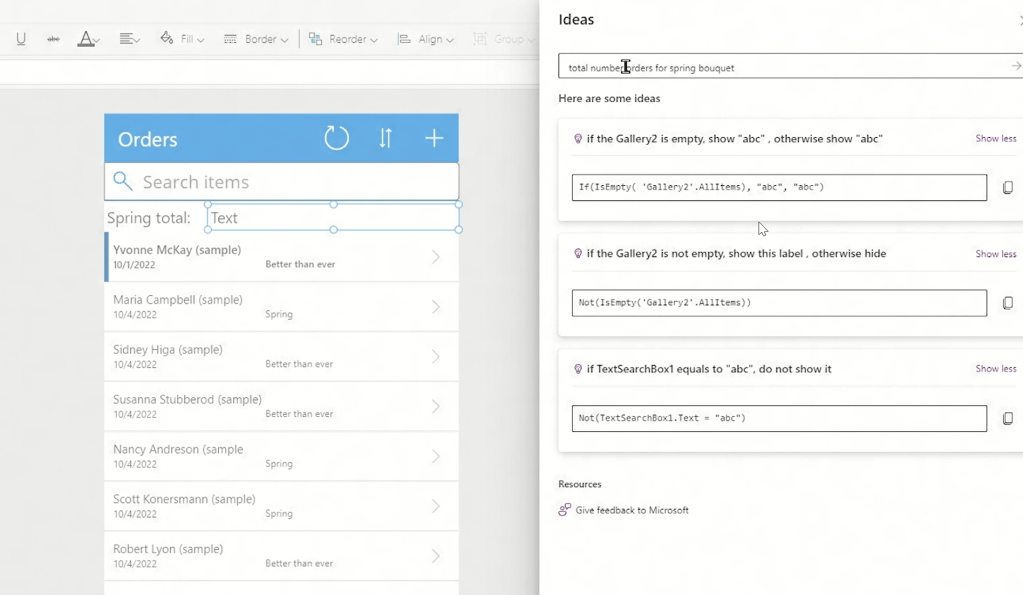 Also you can describe what you want to do in natural language and then Power Fx will generate list of relevant Power Fx formulas to choose from.