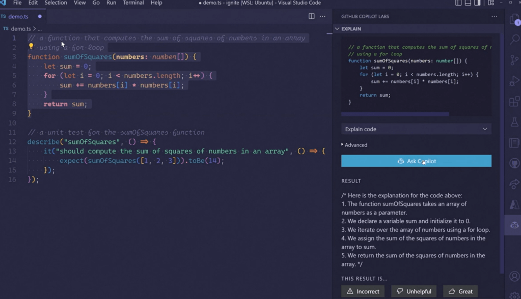 Highlight a code and ask what it does in plain text.
