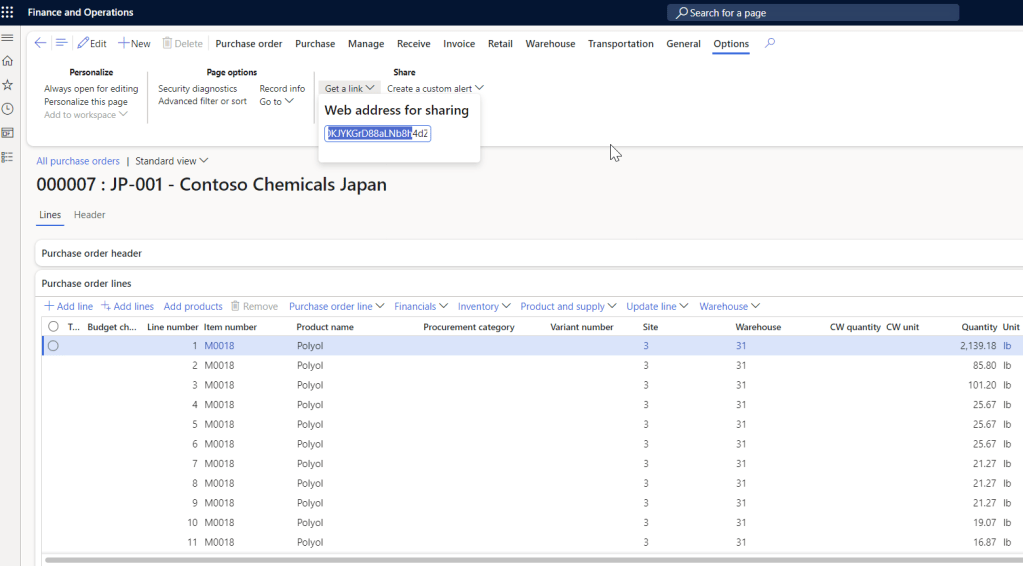 Coming back to our scenario if that person requires more information about this specific PO then he could copy this URL and paste it in Teams or Email which if the other colleague have the access to this menu item then he would be able to directly navigated to this record using that deep link URL.