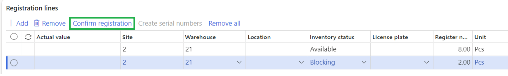 Let’s assume USMF uses both advanced and basic warehouses and the scenario here that there are 10 Items of A0001 received at the basic warehouse 21 but only 8 quantities that you can sell but the rest is unable until discuss with the vendor what actions to be done for that. So therefore you would need to block the inventory for the 2 quantities and receive the rest of the 8 quantities.