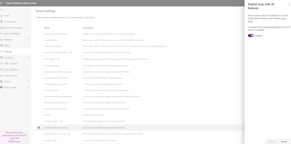 Make sure Publish with AI features are option is enabled from the Power Platform admin center > Settings (Under Tenant settings).