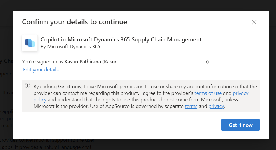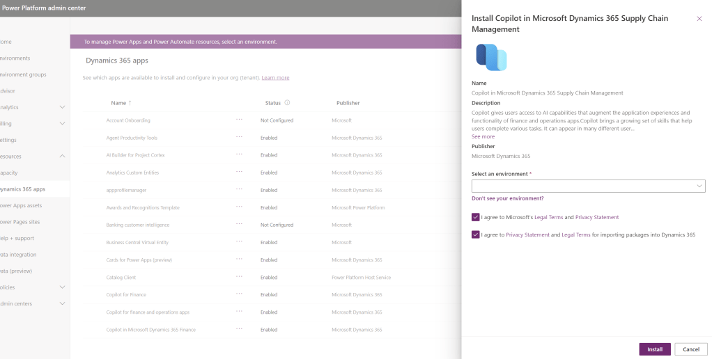 Install copilot in Microsoft Dynamics 365 Supply Chain Management in the environment.